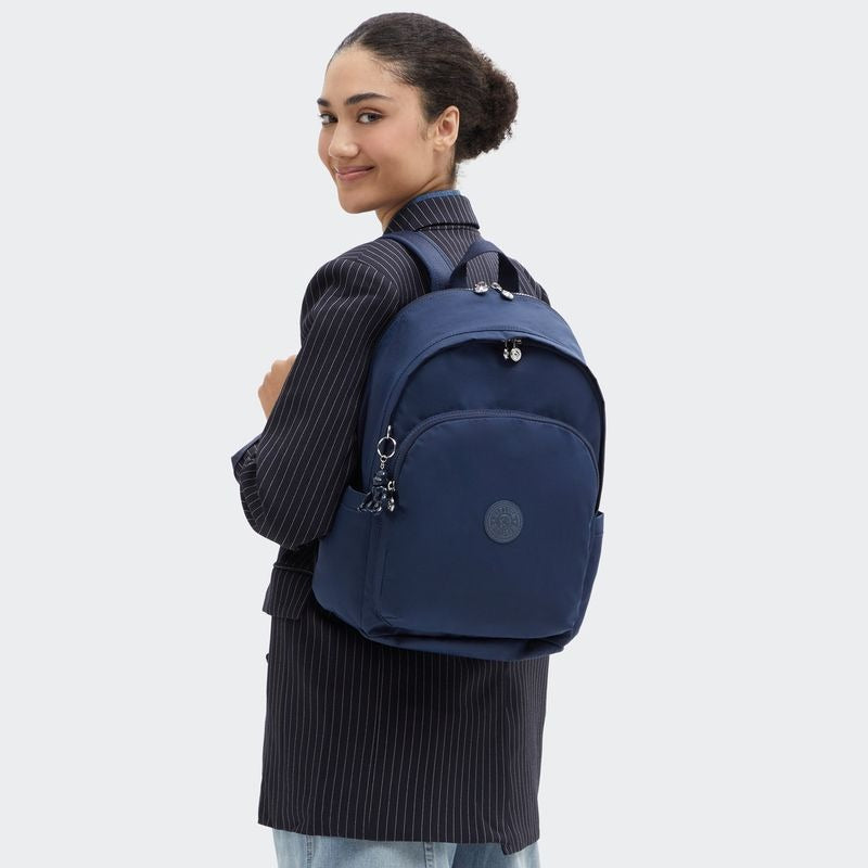 Delia M es la mochila ideal para la universidad o el trabajo. Delia M tiene un compartimento acolchado para el portátil y acoplamiento para maleta. Muévete cómodamente con las correas acolchadas ajustables mientras luces el mono de Kipling y su borla de silicona.